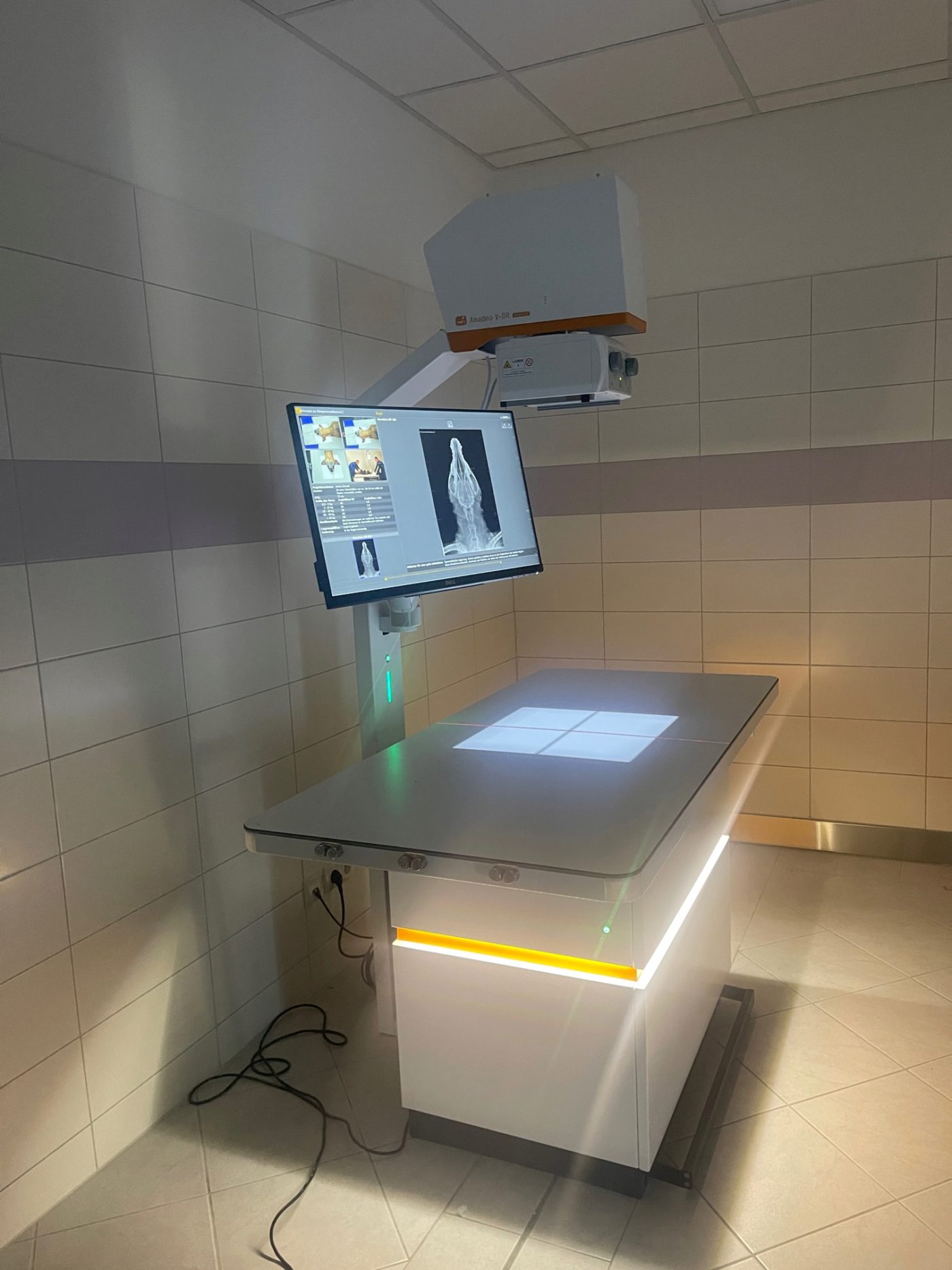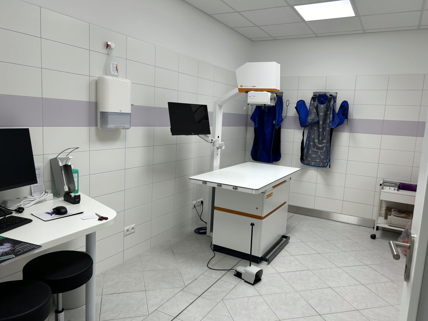 Stationen, Intensivstationen, digitales Röntgen und Ultraschall, Endoskopie, großes Labor, Weichteilchirurgie, teils Knochenchirurgie, Pausenraum mit Tischkicker, spitzen Kaffeemaschine, Bibliothek, Garten.